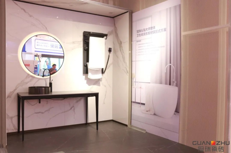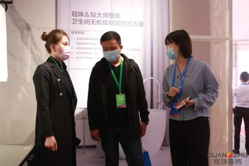 開展當天,冠珠展館就成為焦點:科技感十足的冠珠石墨烯智控發熱瓷磚,耐壓抗污、防滑耐磨的冠珠景觀磚,裝配式新技術等,無一不賦予工程建設全新體驗。