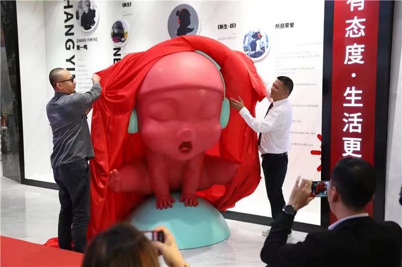 ▲張一鳴現(xiàn)場(chǎng)揭幕《新生·躍》雕塑作品